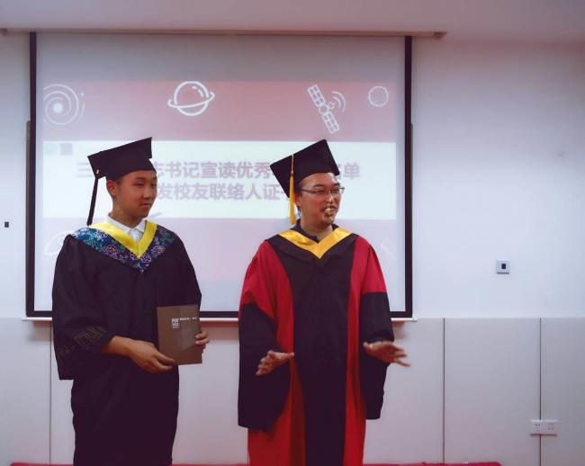 随后,党委书记楼立志老师宣读了2018届本科优秀毕业生名单,并为校友联络人杨乾峰同学颁发校友联络人聘书。楼书记祝贺大家顺利完成学业,希望大家无论未来身在何方,都能够永远铭记在同济测绘的这段宝贵时光,也希望大家能够常回家看看,学院和老师们永远是大家的坚强后盾和温暖港湾。