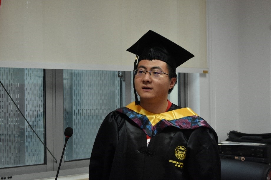 教师代表郝彤代表学院的全体老师向圆满完成学业的毕业生们表示衷心地祝贺,他希望同学们始终拥有一颗童心和好奇心,在成功和困难面前都能够保持孩童般的笑脸,要让这份童心和好奇心在时间和空间尺度上不断延展;始终保持勇气和恒心,困难和挫折会使大家更加强大,也将因此懂得感恩生命中出现的困难,感恩一路同行伸出援手的人们,更感恩那个没有轻言放弃的自己;在辉煌的时候不自我膨胀,在低谷的时候不自怨自艾,不断地超越自己。最后,郝彤老师希望同学们在新时代里更好地找到自己的定位,把握自己在国家富强、民族复兴的历史进程中的责任和使命,并祝福大家在“一生太短、一瞬好长”的芳华岁月中,前程似锦,一帆风顺!