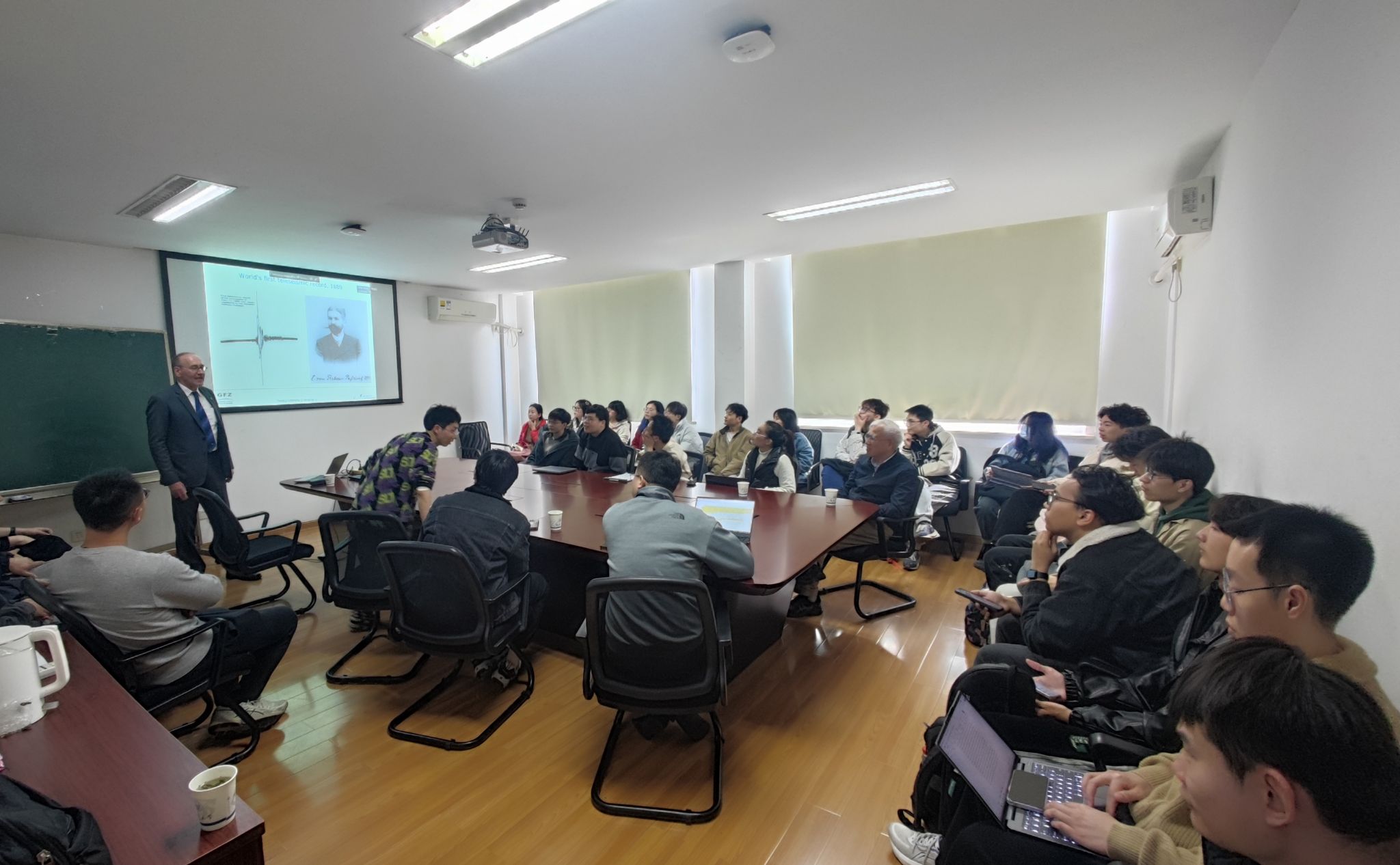 师生带来专题讲座,介绍德国地学研究中心(GFZ)大地测量研究历程与现状,并和师生亲切交流与互动,张磊副院长向Harald Schuh教授介绍了福利吧