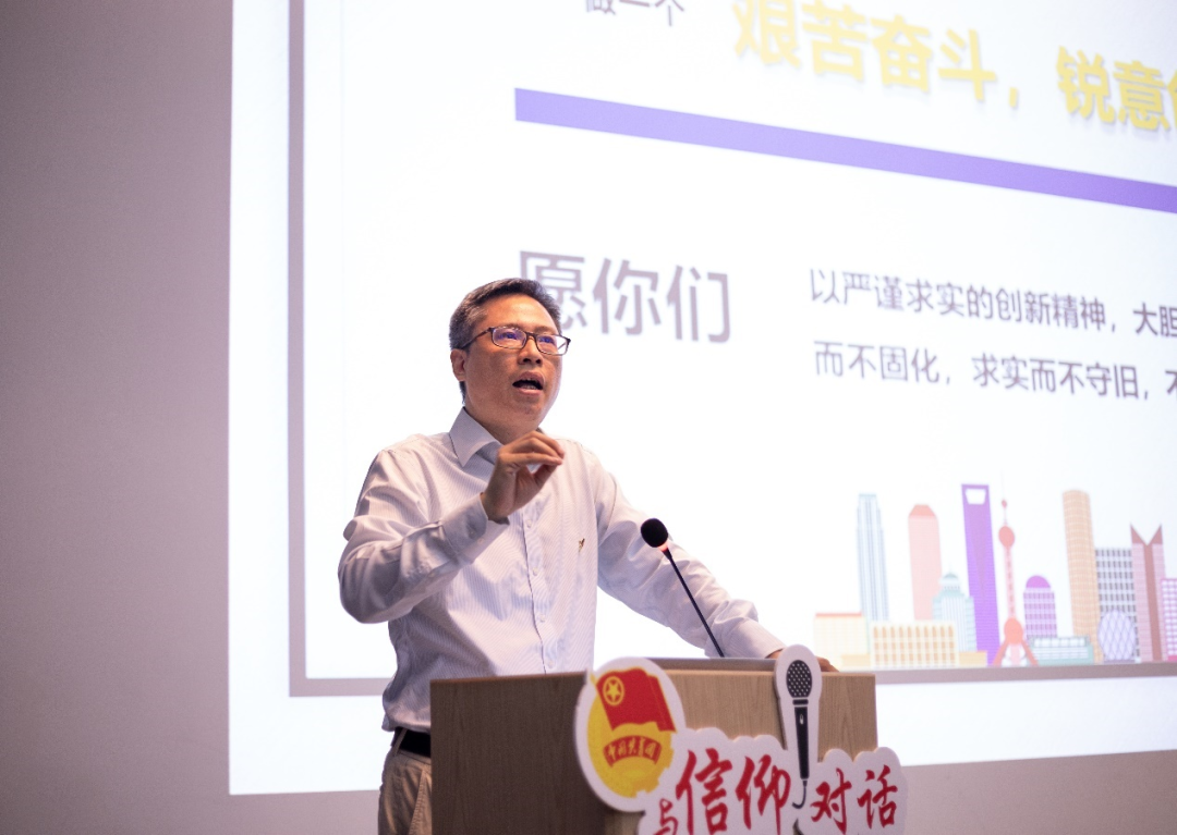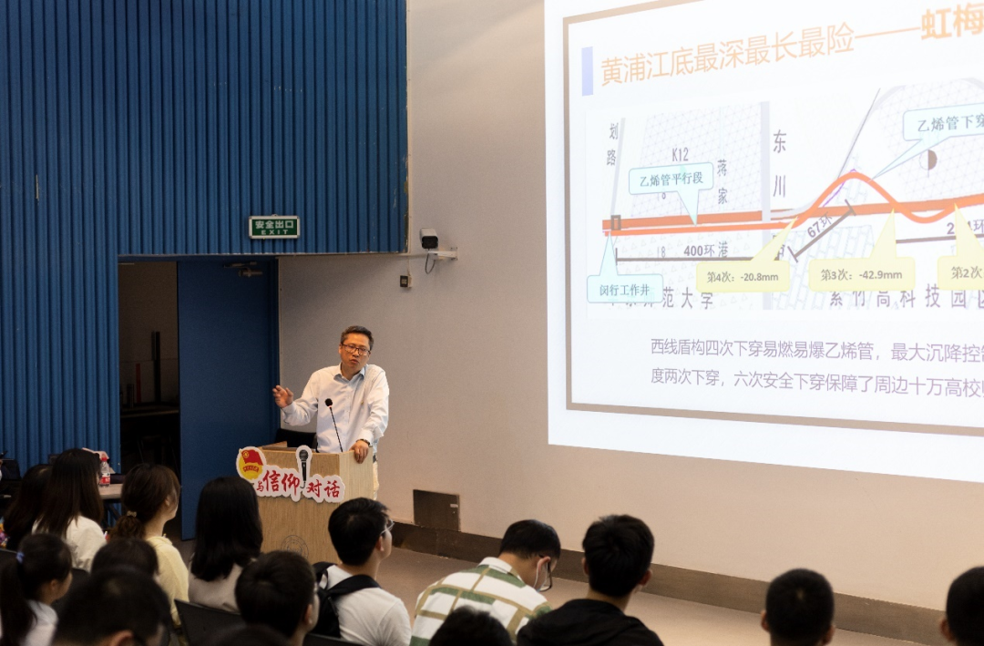 李章林老师讲到在建造虹梅南路隧道时困难众多,过程中极易引发乙烯管道爆炸。身为一名共产党员,李章林老师勇挑重担,多次在危急时刻坚守在工地上,盾构机先后6次近距离成功穿越易燃易爆的乙烯管道,保障了周边十万高校师生和居民的生命财产安全,刷新了超大直径盾构穿越下危险管道的世界纪录。