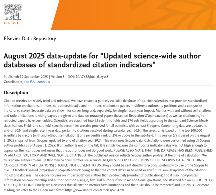 近日,斯坦福大学(Stanford University)和国际权威学术出版社爱思唯尔(Elsevier)共同发布2025年全球前2%顶尖科学家榜单(World's Top 2% Scientists)(第八版),榜单分为“职业生涯科学影响力榜单”(Career-long Impact)和“年度科学影响力榜单”(Single-year Impact)。福利吧